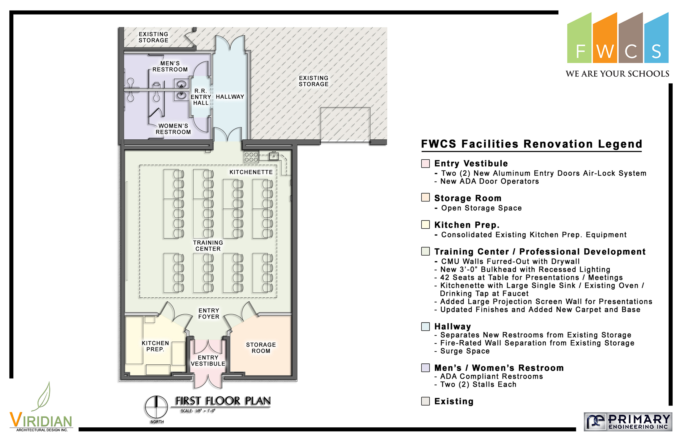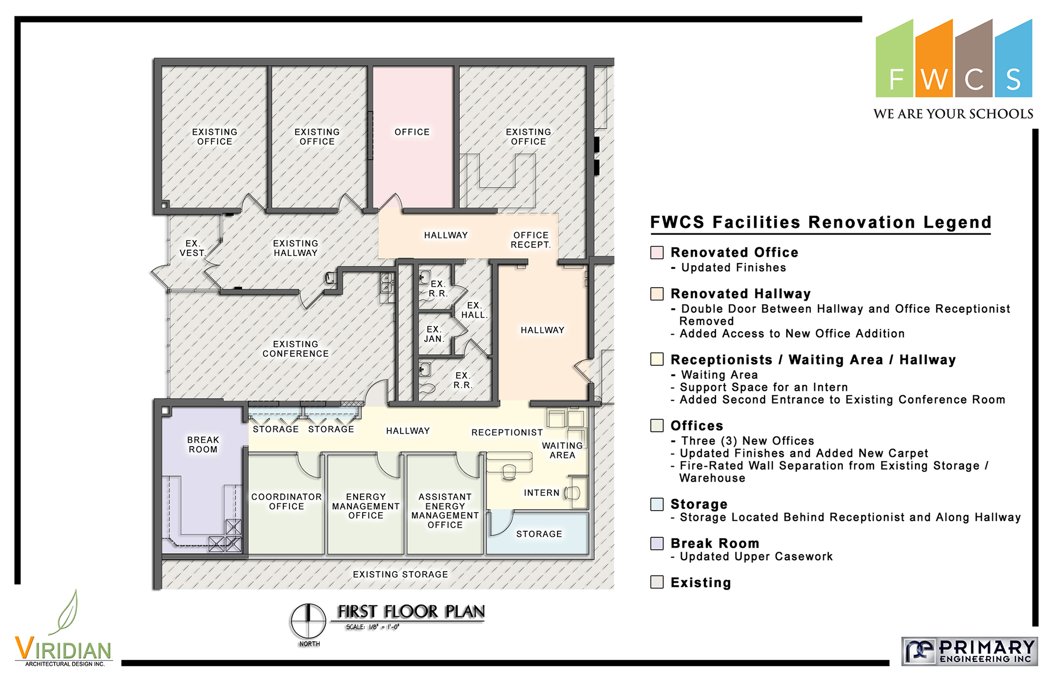 • A new 2-hour fire-rated wall system was added to separate the existing facilities’ storage equipment space from the new administrative space