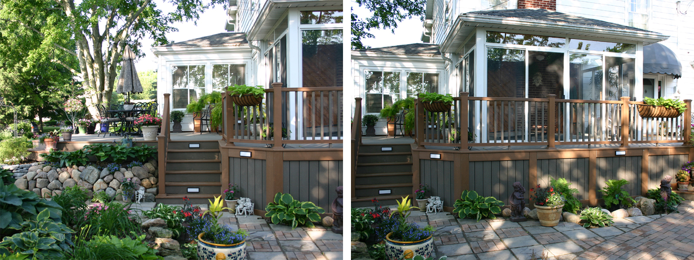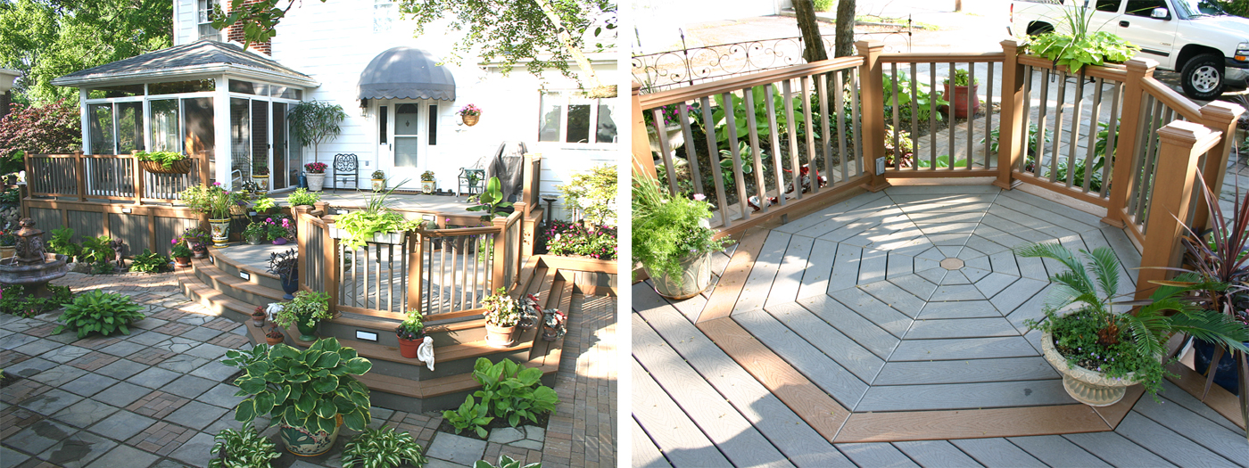 The Huntington deck renovation features a 750 square feet, two-toned multi-level composite Trex® deck, providing minimal maintenance, which replaced the existing 450 square feet pressure treated deck. This provided multiple gathering spaces, including intimate seating, access to the spa room, a grilling area, and a southern deck overlooking a children’s play area. Built-in benches and wrap around stairs provide opportunities for potted vegetation throughout the space. The construction process included excavating and water proofing the existing basement walls. The new deck includes LED step lights, as well as a new brick and concrete patio and additional landscaping.