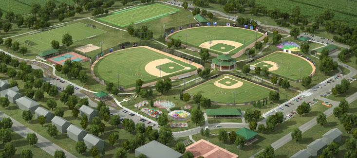 The Woodburn Park Master Plan focuses on the development of a 30 plus acre park located in Woodburn, Indiana. With the assistance of a diverse group of local citizens, community leaders, and organizations we were able to develop a highly detailed list of current priorities for the park. The new park features a “quad” of baseball / softball diamonds around a centrally located concession stand. This facility provides a great entertainment venue for the region by offering basketball, tennis, football, soccer, horseshoes, volleyball, a children’s playground, splash pad, and tot lot among other recreational activities.